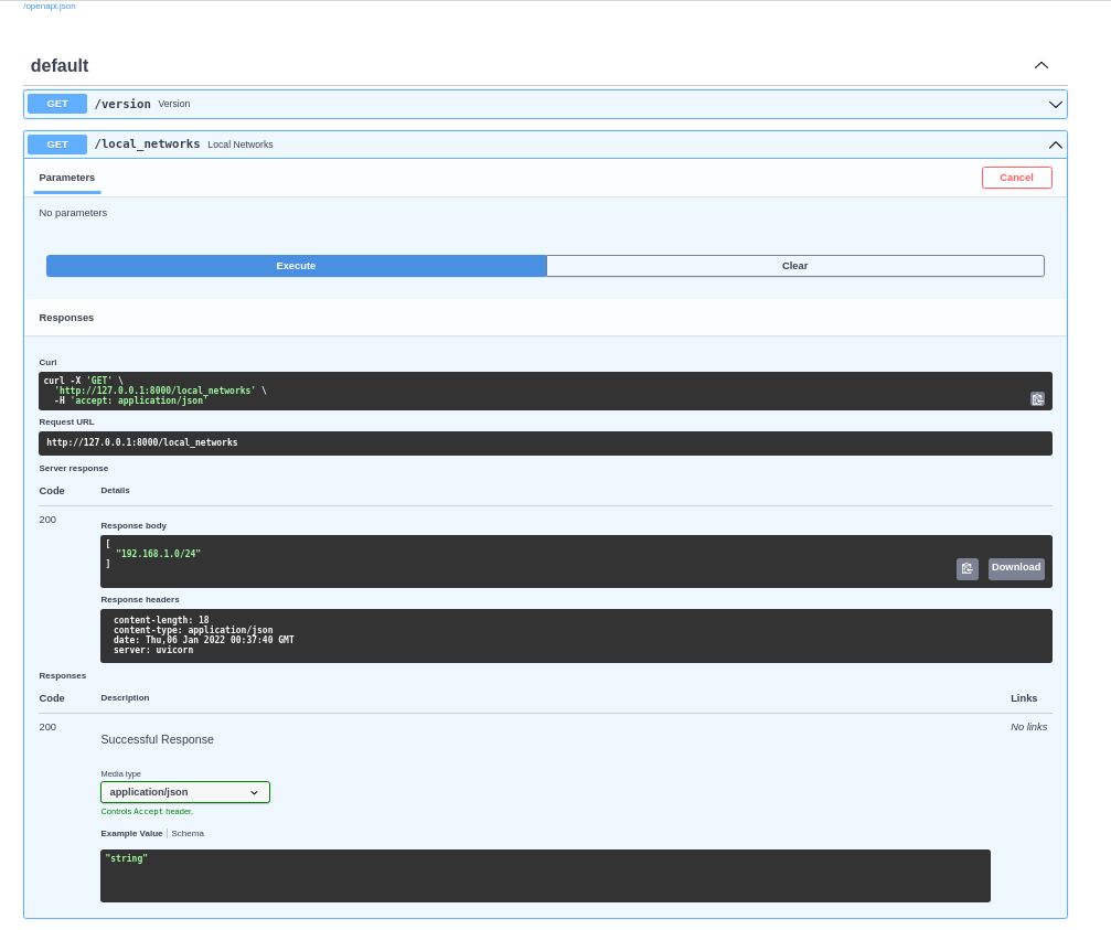 josevnz@raspberrypi:~$ curl 'https://dmaf5.home:8443/local_networks' --header 'accept: application/json' --header 'api-key: e4c03730-02a1-4cb9-8e00-36a63930c064'