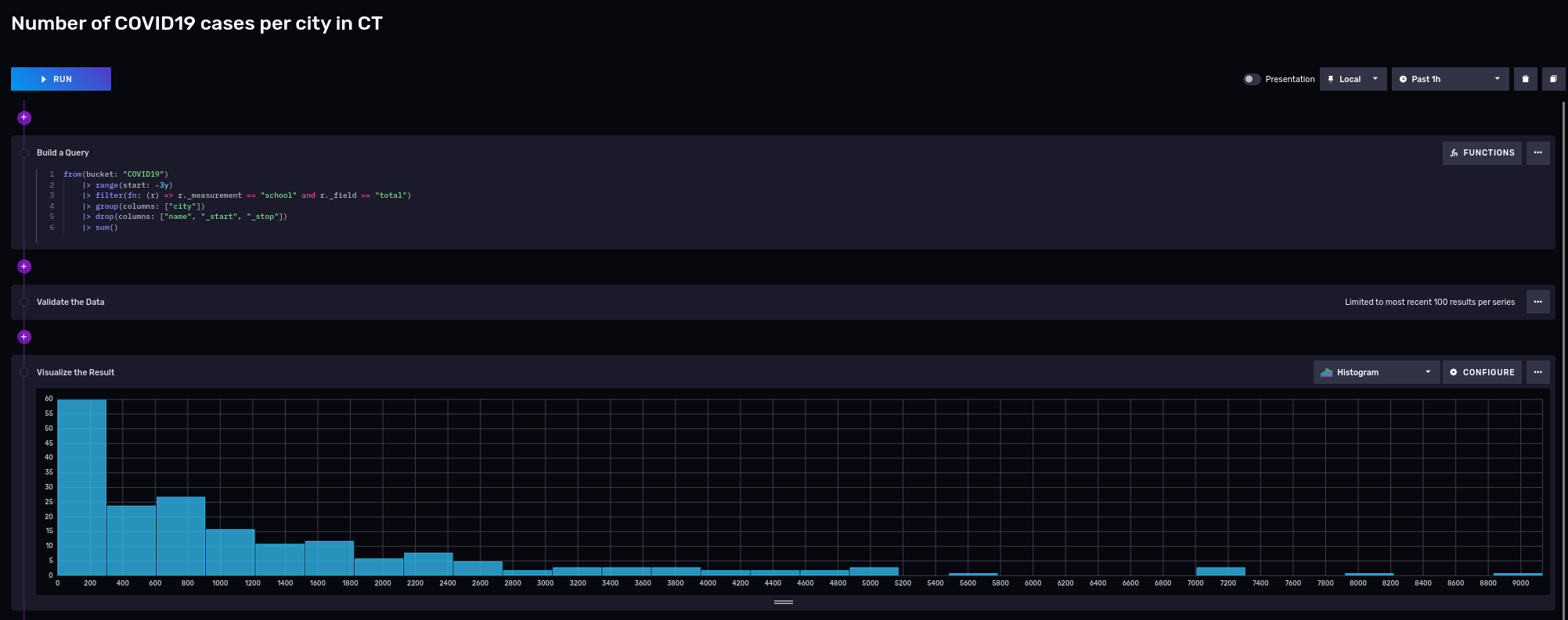 We only need to truncate the precision of our '_time' column to get a time series of the number of cases over time for a period of time, that will 'group' the results into buckets for us.