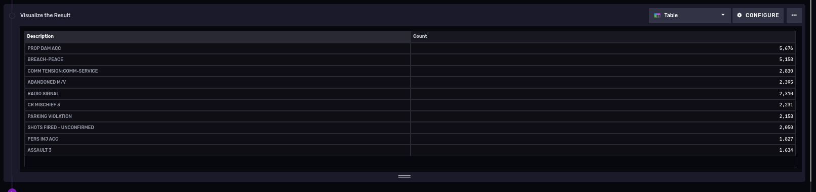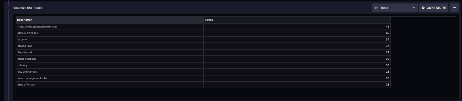 So we see the count per primary description; Also noted that we keep piped the output of the previous group query into another one, so we fit all the results into a single table:
