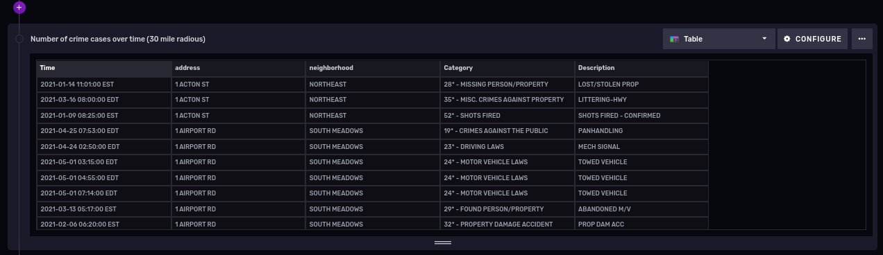 Coming back to our police cases dataset, can we find out the number of crimes for the year 2021, withing a radio of 30 miles on Hartford, CT?