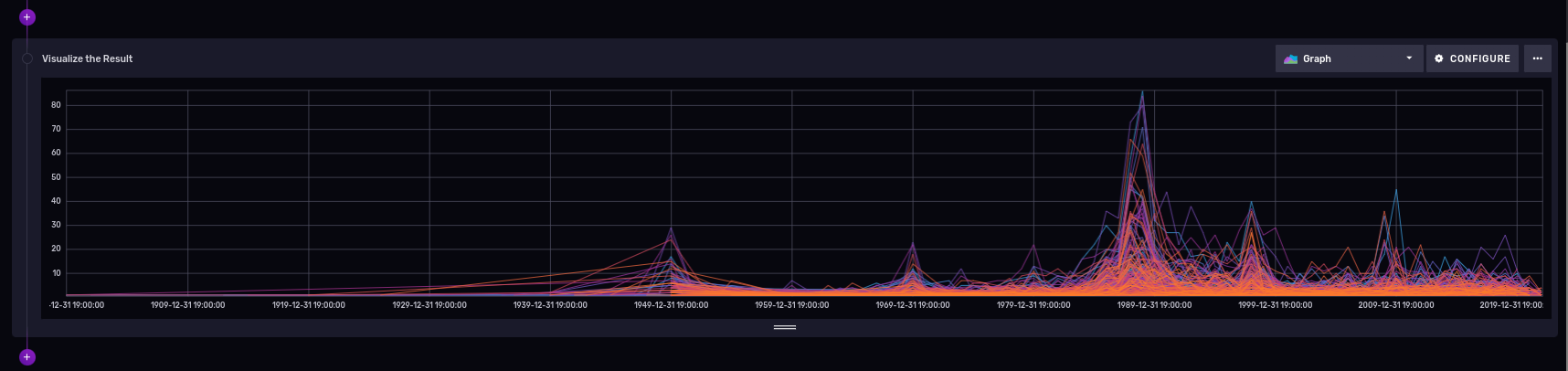This will generate a group of tables (towns) over time (e use the truncateTimeColumn to drop date and time granularity in our series data):