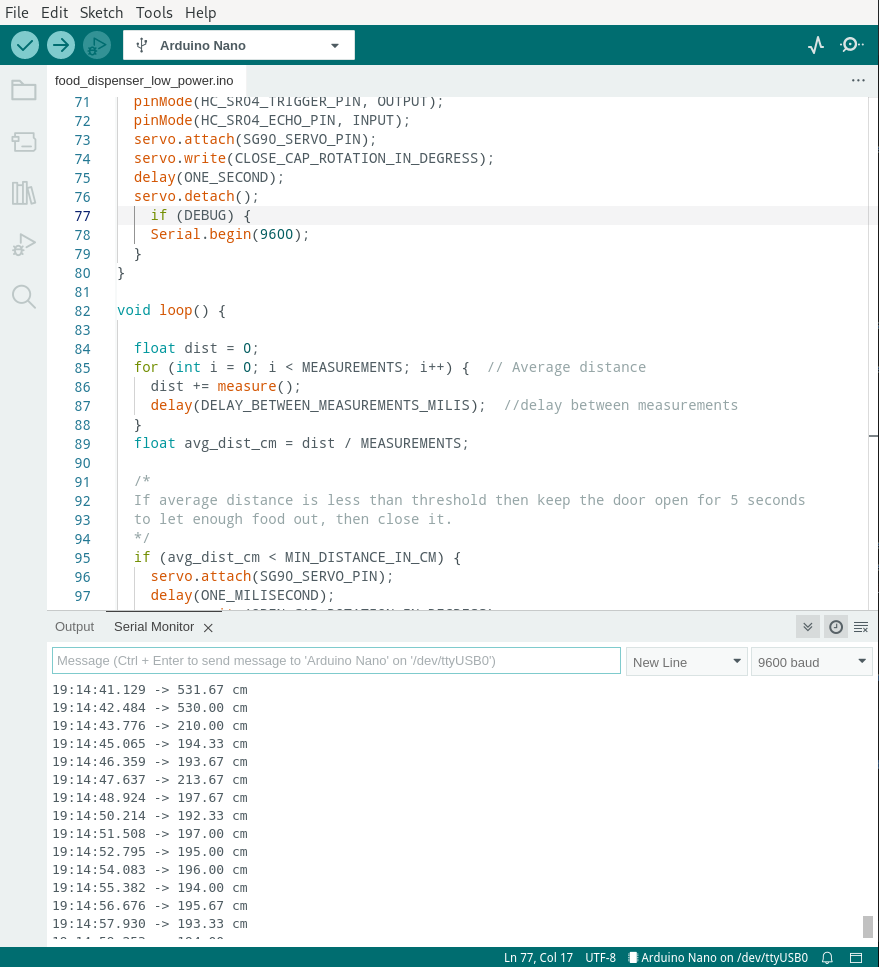 - Get the distance when the ultrasonic sensor is tripped; You can use this to better calibrate the food dispenser, for example, is the plate too close or too far.