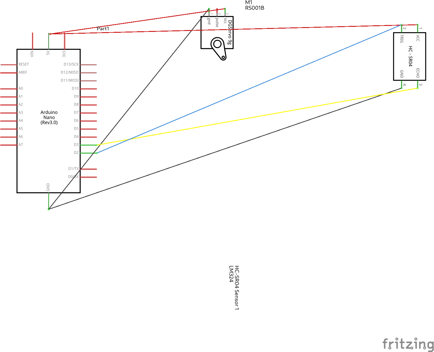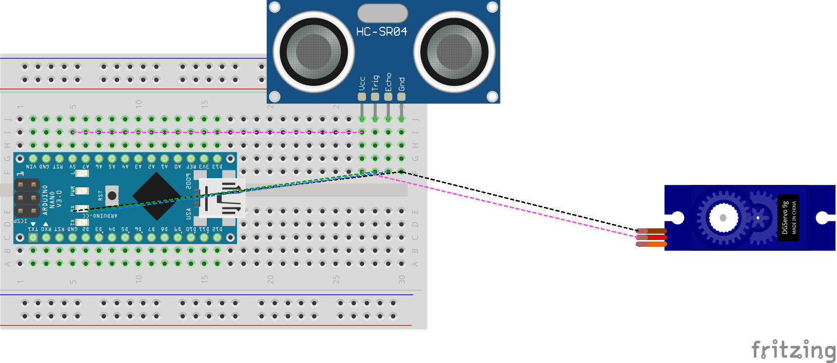 - SG90 Servo connects to pin D9 on Arduino Nano. This moves on a 90-degree angle if an obstacle is detected and the distance is less than 35 cm (or whatever you choose in the code)